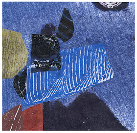 A recent collage. This is Untitled Collage No. 204 (Santa Rosa). Acrylic on paper, acrylic monotype, fragment of a doodling robot drawing in archival marker, collage. August 5, 2018. Image size: 13.3 x 13.1cm (5.2 x 5.2 inches). Matted to 11 x 14 inches. Signed on the mat. Signed and dated on the reverse. One of a number of recent pieces I've done using mostly blue monotypes.